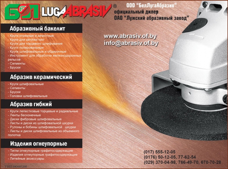 ООО «БелЛугаАбразив» предлагает Вам абразивный инструмент производства ОАО «Лужский абразивный завод»,(Россия, г. Луга): абразивный инструмент на бакелитовой связке; абразивный инструмент на керамической связке; абразивный инструмент на гибкой основе; изделия огнеупорные графитосодержащие и шамотные.