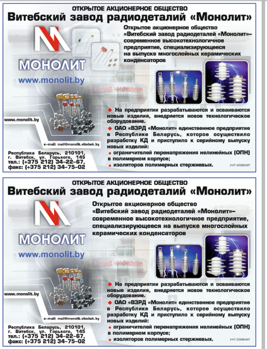 Открытое акционерное общество "Витебский завод радиодеталей "Монолит" (ОАО "ВЗРД "Монолит") - современное высокотехнологичное предприятие с 56-летней историей. Созданное в 1958 году, предприятие специализируется на производстве электронных компонентов, является крупнейшим производителем монолитных керамических конденсаторов в СНГ и остается единственным предприятием такого профиля в Республике Беларусь.